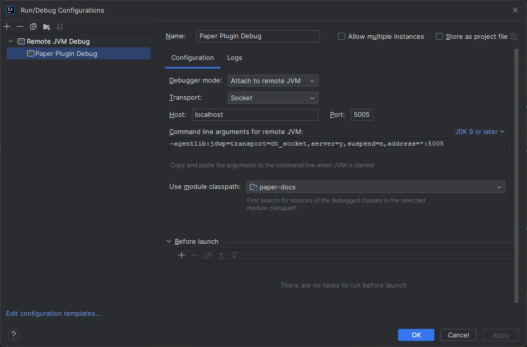 Then, click the + button in the top left and select Remote JVM Debug. You can then name the configuration whatever you want, and click Apply: