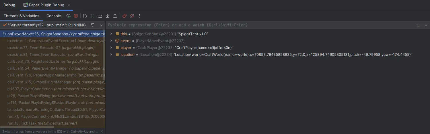 Section titled “Using direct debugging”Direct debugging will allow you to run the server directly from your IDE, and will allow you to use breakpoints and step through your code. We can achieve this by using JPenilla’s Gradle plugin to run the server directly from the IDE. See here for instructions on how to set up the plugin.